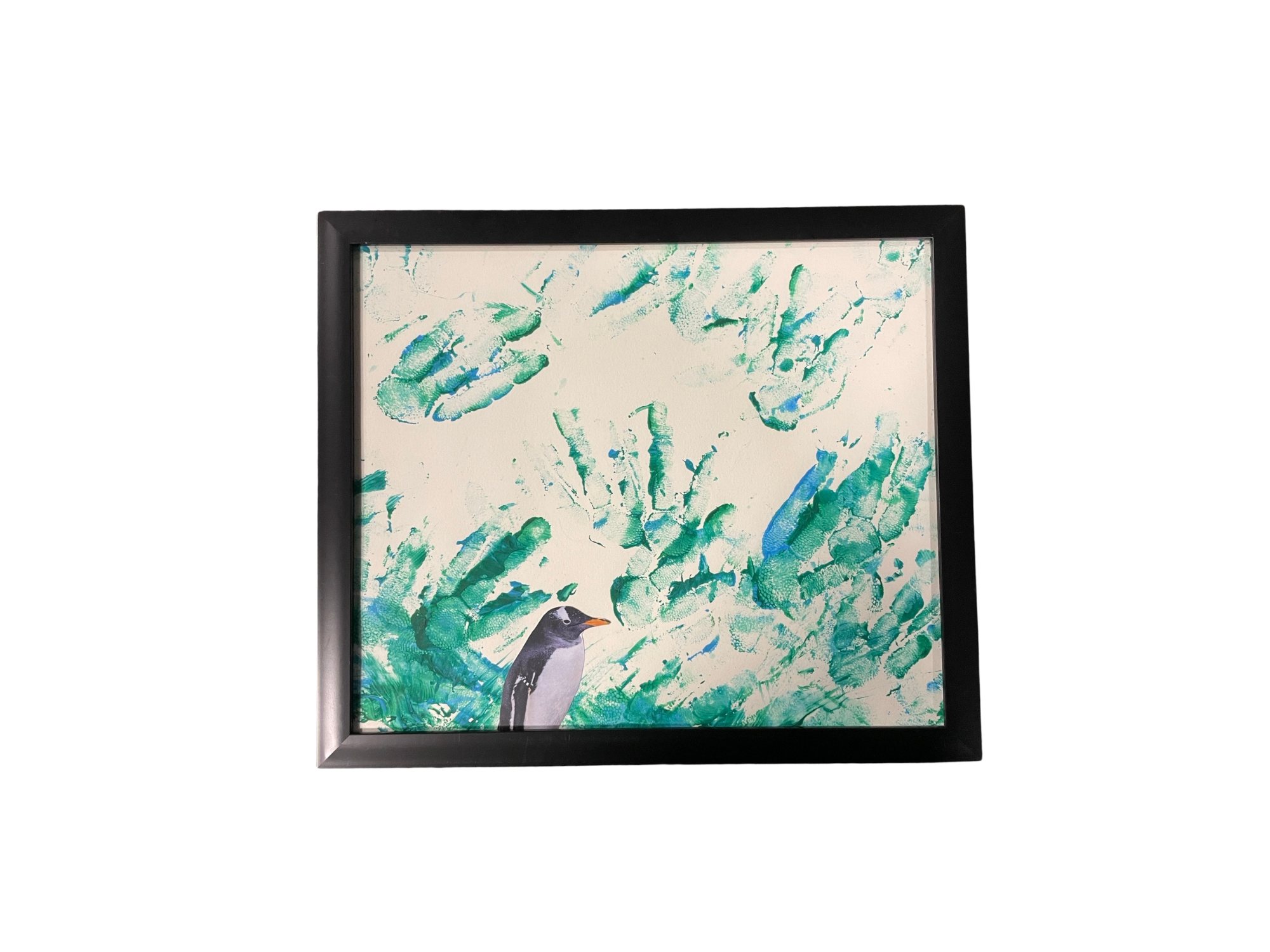 Own a one-of-a-kind piece of Penguin Art and support gentoo penguin conservation! This medium-sized framed print (280mm x 320mm) showcases artwork created by our gentoo penguins as part of their enrichment activities. Using “penguin-friendly” paints, our penguins waddle, splash, and interact with the canvas, creating unique and vibrant pieces of art.