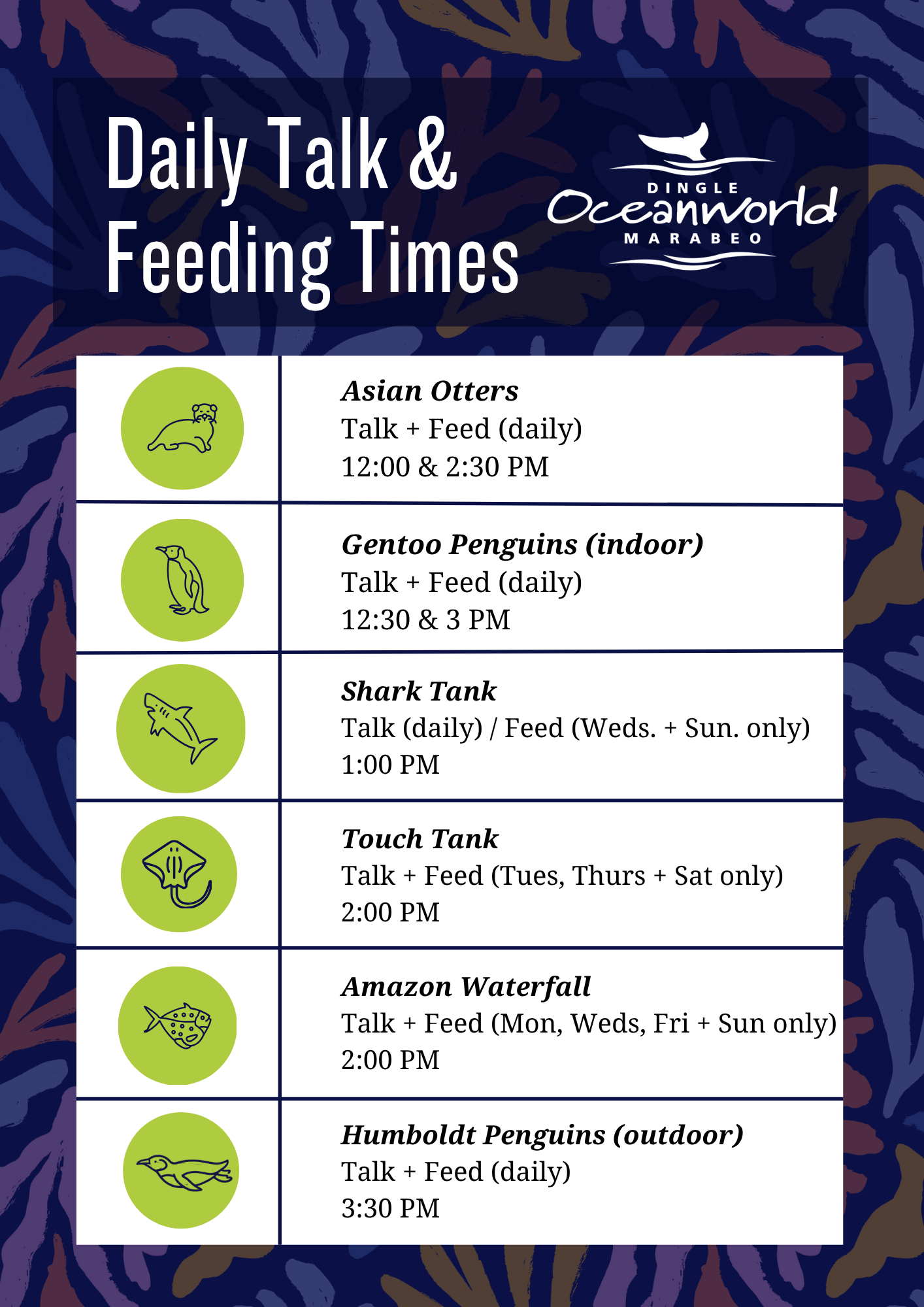 Have your pre-booked tickets ready to scan, either printed or on your mobile device. If buying at reception, we accept cash, card, and Oceanworld gift vouchers.